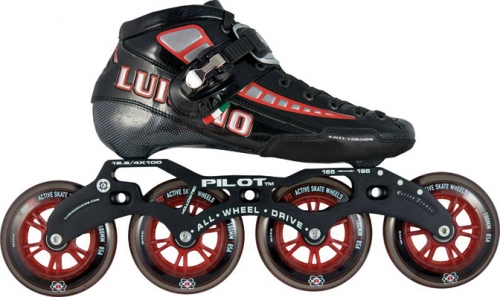 Composite glass boot with neoprene lining, slide mounting system for perfect frame adjustment, heat moldable. The Pilot frame is milled from 6000 series aircraft aluminum with single axle system, 4-wheel 100 mm 195 mount. 100MM Luigino speed wheels, Luigino perfect ABEC 5 bearings.